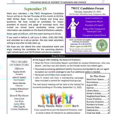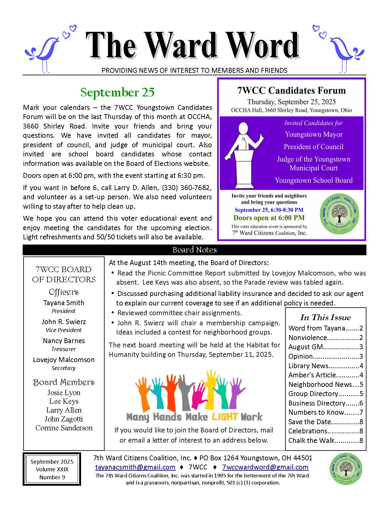 The Ward Word newsletter provides news of interest to members and friends of the 7th Ward Citizens Coalition. Published monthly, print editions arrive in member's mailboxes mid month. We also offer a full-color "Digital Edition" with live links to those who prefer their newsletter to arrive as a pdf via email. The Ward Word helps members, including those who are unable to attend meetings, to stay informed and connected to the community. If you would like a free sample of the digital edition, email a request to: 7wccwardword@gmail.com